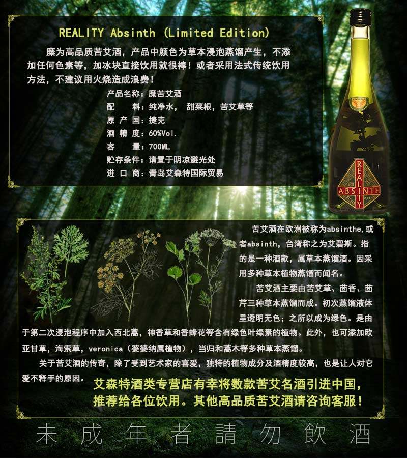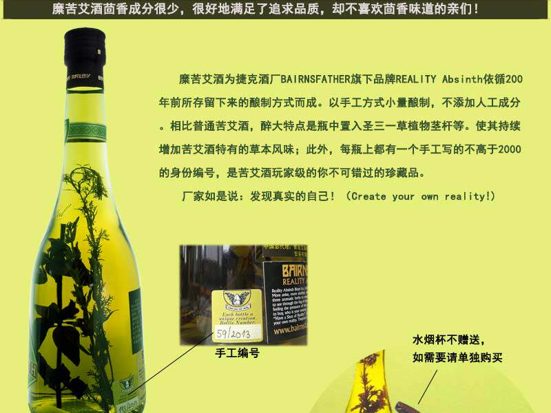 产品描述:糜是一款品质出众的苦艾酒。Reality 是小量酿制的产品,每瓶上都有一个手工写的编号。厂家如是说: 发现真实的自己!(Create your own reality!...