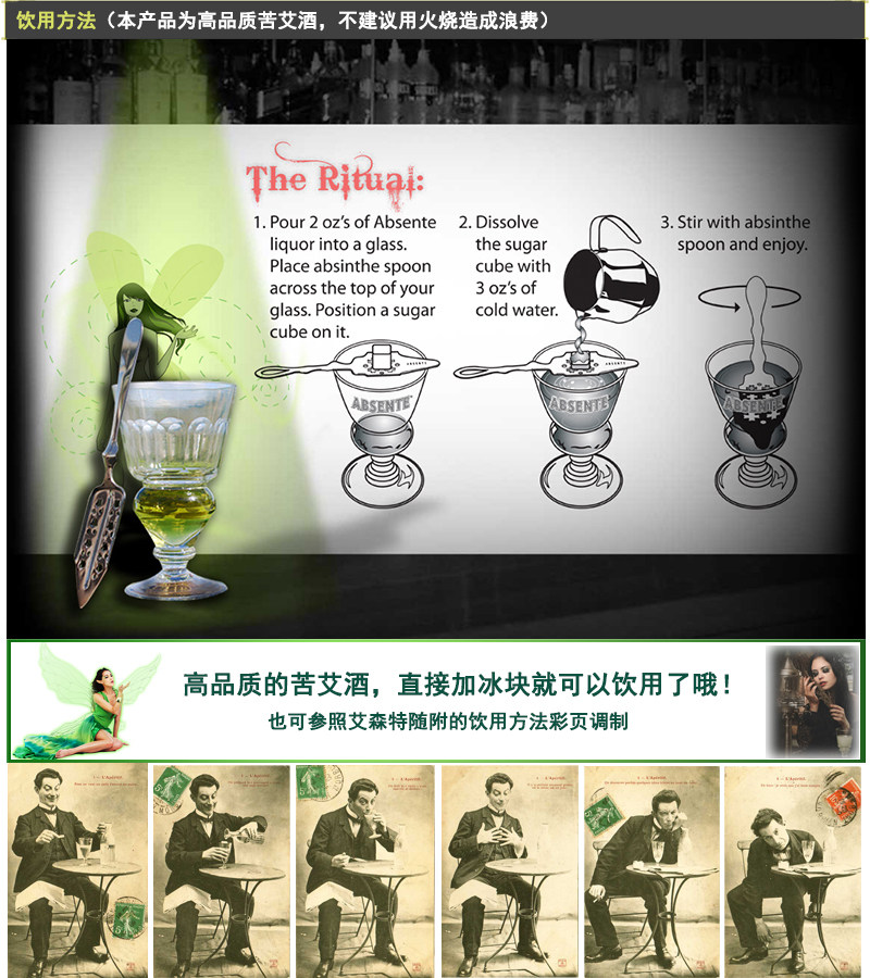 客人如此描述“糜”:浅琥珀色泽,酒瓶中还浸泡着处理过的苦艾草。酒质极其浓郁,甜度不高,适合传统的方糖滴入法,兑冰水饮用。这是一款品质出众的苦艾酒。